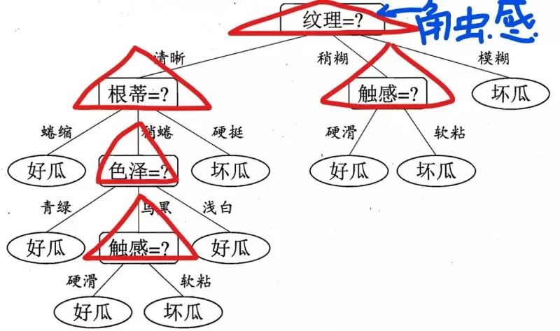 不换成触感,或者其它特征为什么也不行呢?为什么选择的是纹理,这是以什么标准来选择特征的?这就是我们要说的决策树的关键步骤是分裂属性。
