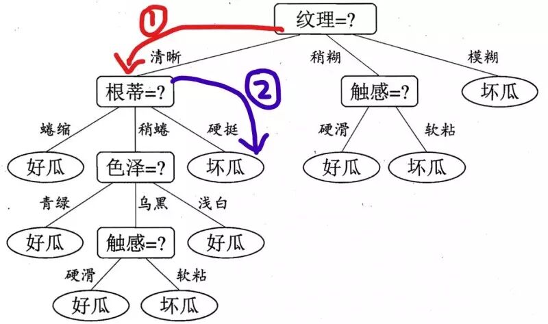 假如我现在告诉你,我买了一个西瓜,它的特点是纹理是清晰,根蒂是硬挺的瓜,你来给我判断一下是好瓜还是坏瓜,恰好,你构建了一颗决策树,告诉他,没问题,我马上告诉你是好瓜,还是坏瓜?