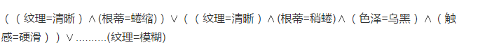 从树根到树叶的每一条路径对应一组属性测试的合取,树本身对应这些合取的析取。理解这个式子,比如上图的决策树对应表达式为: